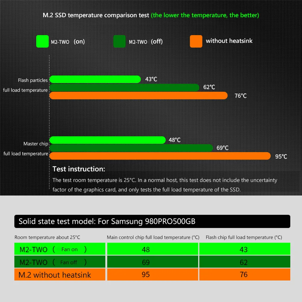 M.2-TWO M.2 SSD PCI-E NVMe Heat Sink M2 2280 Solid State Hard Disk Radiator with Fan Aluminum Heatsink Cooling Thermal Pad Cooler for Desktop PC Accessories Feature: 1.Solid Material: This Hard Disk Radiator Cooler is made of Metal shell metal base which is more stable structure and durable, can not only efficiently dissipate heat, but also protect M2 hard disk.2.High Efficiency: This Heatsink has Maximum air volume: 1.35CFM, in order to avoid taking up too much space inside the chassis, M2-TWO uses a 20*20*10mm exquisite fan, the speed is up to 14000RPM, although the size is small, the performance is strong.The 2010 high-speed fan blows out the heat quickly to ensure that the hard disk works efficiently and with low noise: ≤24dBA 3.Grille shape Design. The heat sink adopts a grille shape, which increases the heat dissipation area and ensures the smooth flow of the air path, which is convenient for the rapid dissipation of heat. Maximum wind pressure: 4.31mmH2O. 4.Easy to install: Tool free design, no need screw driver. which is easy to install and has a remarkable effect. 5.Note: This product does not contain a hard disk, only for the product effect. M.2-TWO M.2 SSD PCI-E NVMe Heat Sink M2 2280 Solid State Hard Disk Radiator with Fan Aluminum Heatsink Cooling Thermal Pad Cooler for Desktop PC Accessories Description: While M.2 SSD provides ultra-high read and write performance, it inevitably faces a serious problem-heating! Its short size collects a lot of heat during the process of reading and writing data. Once the heat is accumulated due to poor heat dissipation, the performance of the SSD will be degraded, and the data transmission will be lost or even the hard disk will be damaged! In view of this, the M2-TWO radiator that can effectively reduce the temperature of M.2 SSD has been developed, which is easy to install and has a remarkable effect. Feature: Solid material. Metal shell metal base, stable structure, durable, can not only efficiently dissipate heat, but also protect M2 hard disk High speed 2010 fan. Maximum air volume: 1.35CFM, in order to avoid taking up too much space inside the chassis, M2-TWO uses a 20*20*10mm exquisite fan, the speed is up to 14000RPM, although the size is small, the performance is strong Aluminum alloy heat sink. The heat of the M2 hard disk is conducted to the aluminum alloy heat sink through the thermal grease. The 2010 high-speed fan blows out the heat quickly to ensure that the hard disk works efficiently and with low noise: ≤24dBA Grille shape. The heat sink adopts a grille shape, which increases the heat dissipation area and ensures the smooth flow of the air path, which is convenient for the rapid dissipation of heat. Maximum wind pressure: 4.31mmH2O Specification: Model: M.2-TWO Color: black Cooling method: active cooling Rated voltage: DC12V Rated current: 0.054A Input power: 0.65W Fan speed: 14000RPM Maximum air volume: 1.35CFM Maximum wind pressure: 4.31mmH2O Noise level: 24dBA(MAX) Application: 2280 solid state drive Size: 74.5*24.5*27mm Net weight: 60g Note: This product does not contain a solid state drive, just for the product effect Due to the different monitor and light effect, the actual color of the item might be slightly different from the color showed on the pictures. Thank you! Please allow 1-2cm measuring deviation due to manual measurement. ![]() 1 x Heatsink(SSD not included) ![]() ![]() ![]() |