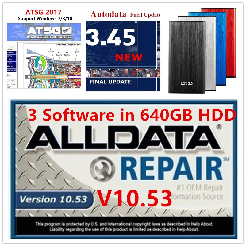 1pc X 640GB HDD (Alldata v10.53 , Auto-data 3.45 , Atsg 2017 three software and install video in hdd )