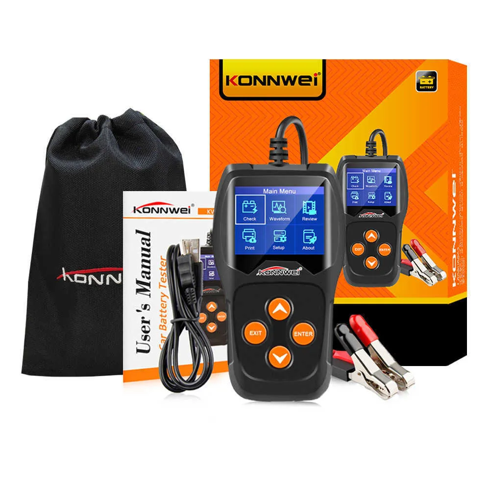 ,KONNWEI KW600 is mainly targeted to analyze the battery healthy status to calculate the actual cold cranking, capability of the battery and the aging extent, which provide reliable analysis evidence for the test and maintenance of the battery. KW600 notifies the users to replace battery in advance when the battery getting aged1. Identify battery status Good or Replace2. Check Battery Capacity - Cold Cranking Amps (CCA), DIN, EN and IEC information relative to battery rating.3. Check Internal resistance value (Ohm)4. Display battery life in percentage (%)5. Battery Cranking Test, load test6. Battery Charging Test, Ripple Test7. Graphing voltage real time monitoring & review8. All test results storage and review9. Print/upload all test results and battery report on PC for deep analysis.10. Life time update online Free