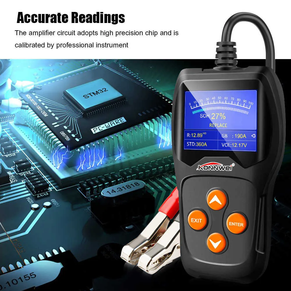 ,1. Fast and smooth running speed with STM-32 chip set hardware 2. Accurate test results, using high precision amplifier and calibrated by professional battery testing tool, KW600 reading accuracy up to 99%. 3. Wide testing range cover from CCA 100- 2000 , 30- 220 AH, best in the market.4.Industry initiative graphical Battery Voltage real time monitoring, can be uploaded to PC for analysis. 5. Unique battery results display in percentage and meter mode. 6.Test all automotive cranking lead acid battery, including ordinary lead acid battery, AGM flat plate battery, AGM spiral battery, and Gel battery, etc. 7. Polarity reverse connection protection, reverse connection will not damage the tester or affect the vehicle and battery. 8. Directly test the battery with loss of electricity, no need to full charge before testing. 9. Testing standards include currently the world's majority of battery standards, CCA, BCI, CA, MCA, JIS, DIN, IEC, EN, SAE, GB. 10. Data Storage and upload to PC for printing 11. Life time upgrade free by one-click smart cloud update 12. Large color screen LCD display, pattern design