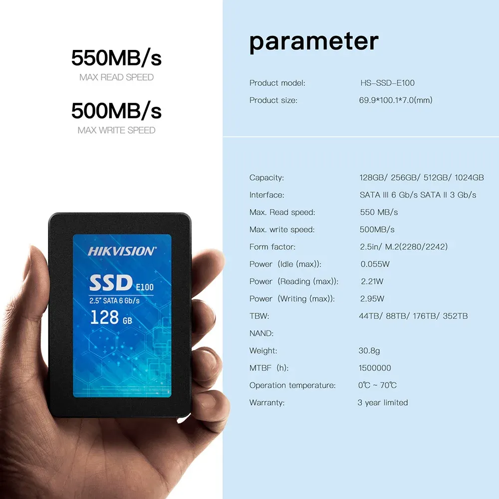 HIKVISION E100 series solid state drive is developed from years of experience and expertise on storage technology and flash memory management. This product is specialized for optimization of computer operating systems and offers stable and fast data service by accelerating startup and performance.
