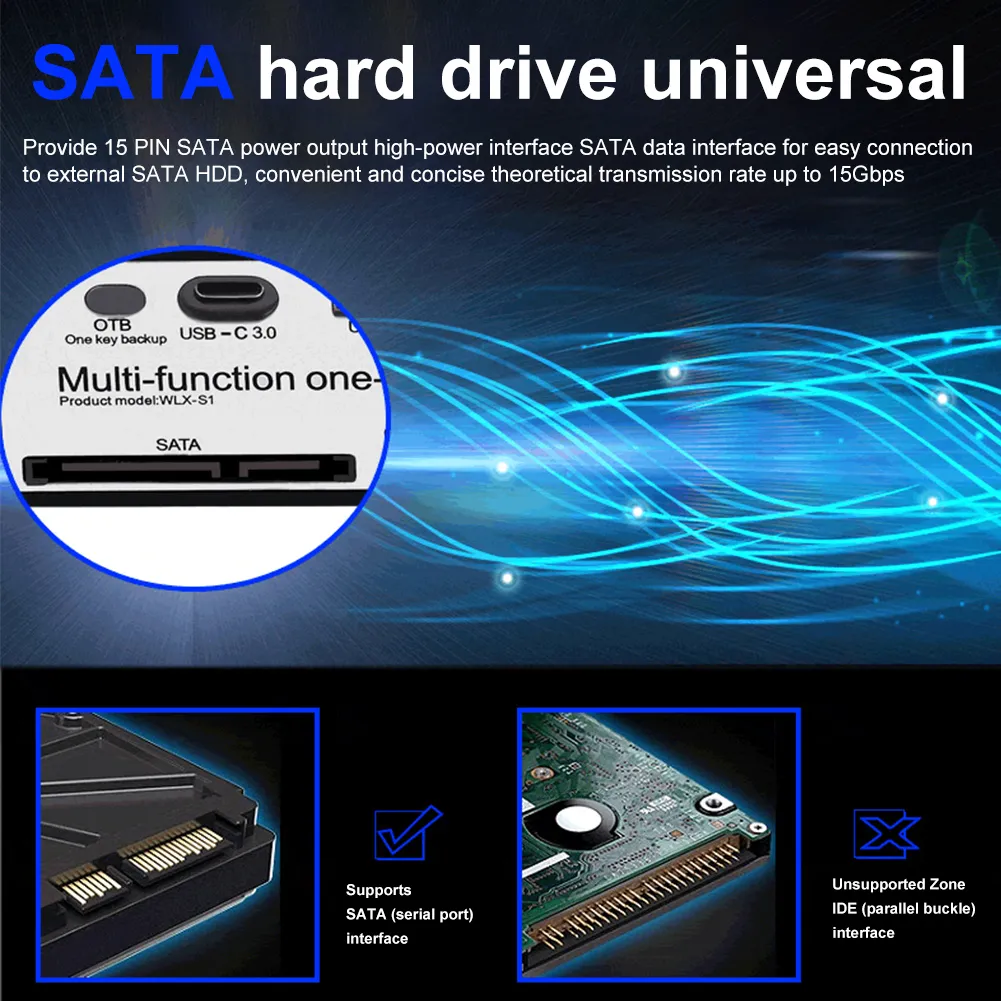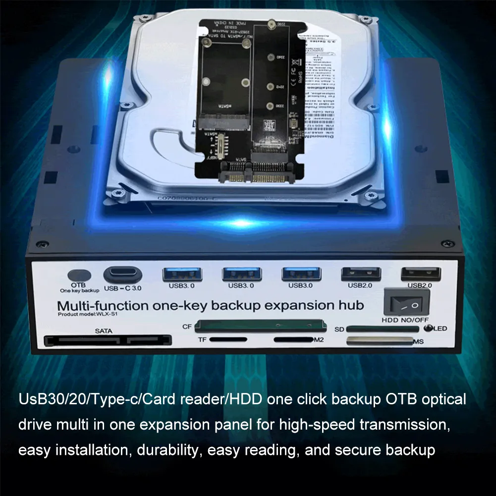 5.25inch Multi-Function Expansion Hub 3*USB3.0 2*USB2.0 1*USB-C Optical Drive Extension Panel External Hard Disk Drive Hub with SATA 5Gbps One-Key Backup for 2.5& 3.5 SATA Hard Disk/M.2 NGFF/Msata SSD Feature: 1. Multi-interface Expansion: This PC front panel USB hub offers various interfaces and functions, allowing you to expand mechanical hard drives (HDD) and M.2 NGFF/mSATA SSD solid-state drives in the 5.25" drive bay. Users can conveniently use different types of hard drives on the same device, making data storage and management easier. 2. Front Panel Design: This multi-function expansion hub features a front panel design, allowing users to directly insert and remove hard drives from the computer`s front panel, saving installation and connection time. Users can easily insert, replace, and operate hard drives, enhancing their availability and usability. 3. Multiple Interface Support: This hdd docking station supports multiple interfaces, including SATA, M.2 NGFF, and mSATA interfaces. It is compatible with various hard drive specifications and types, catering to different user needs. This enables users to freely choose and combine hard drives of different specifications to meet storage and performance requirements. 4. Hard Drive Expansion and Data Transfer: This external hard disk drive not only provides hard drive expansion capabilities but also supports high-speed data transfer. By utilizing the SATA interface, users can achieve fast data transfer and efficient read/write speeds, improving the performance and productivity of the hard drive. This is particularly important for users who require high-capacity storage and fast data access. 5. Suitable for Various Scenarios: This hard drive hub is suitable for various scenarios, including personal computers, office computers, and servers. It can be used to expand hard drive space and functionality, providing flexible storage solutions to meet different user needs and application scenarios. Specification: Origin: Mainland China Interface Type: USB 3.0 Ports: 6 Standard: USB 3.0 Funtion: None Package: Yes 3*USB3.0_AF interface, data transfer rate 5Gbps 2*USB2.0_AF interface, data transfer rate 480Mbps 1*USB-C (Type C) 3.0 interface, data transfer rate 5Gbps Built-in SATA: Support 2.5-inch and 3.5-inch SATAI/II/III HDD and M.2 B key NGFF(For 2230/2242/2260/2280mm)/Msata SSD SSD (No HDD, No Memory Capacity) (PCIE protocol Nvme SSD not supported) OTB one-click backup: easily and quickly transfer files from PC to HDD SSD/HDD HDD switch: control the built-in SATA HDD on and off Support card reader M2/TF/SD/MMC/MS/CF LED card reader read/write status indicator External SATA: Provide power and data transmission All-in-one cable, connecting cable: 1*20PIN cable, 1*SATA cable, 1*USB2.0 cable, 1*4PIN power cable, M.2/Msata SSD adapter card Product size: 148.00x140.00x41.00mm Product Size: 5.83x5.51x1.61in ch Note: 1 x PC Front Panel USB Hub |