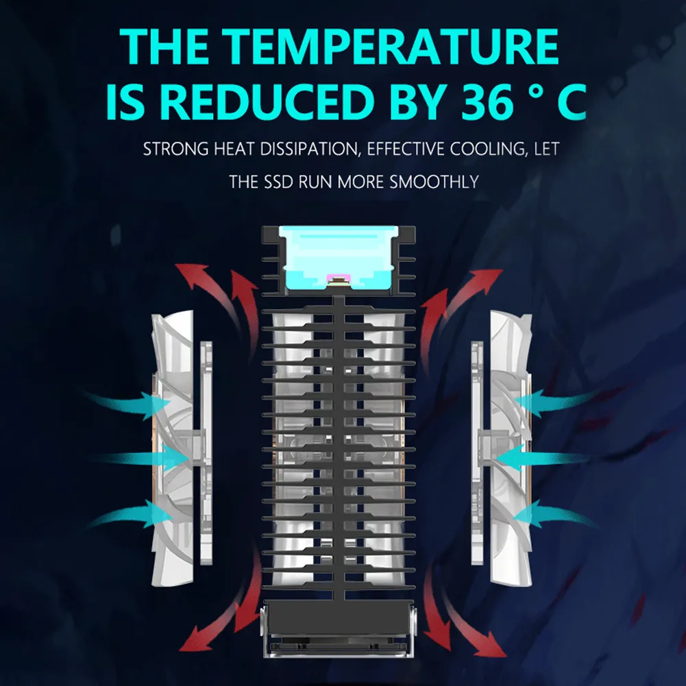 1.Dual Fan High-Efficiency Cooling:  M.2 2280 SSD heatsink equipped with two 50mm hydraulic bearing silent fans, providing double the airflow to effectively reduce the temperature of M.2 solid-state drives (SSDs) by more than 30 degrees. This ensures stability, reliability, and extends the lifespan of the SSD. The fan speed can reach 1000-4500RPM, maximizing the cooling effect.