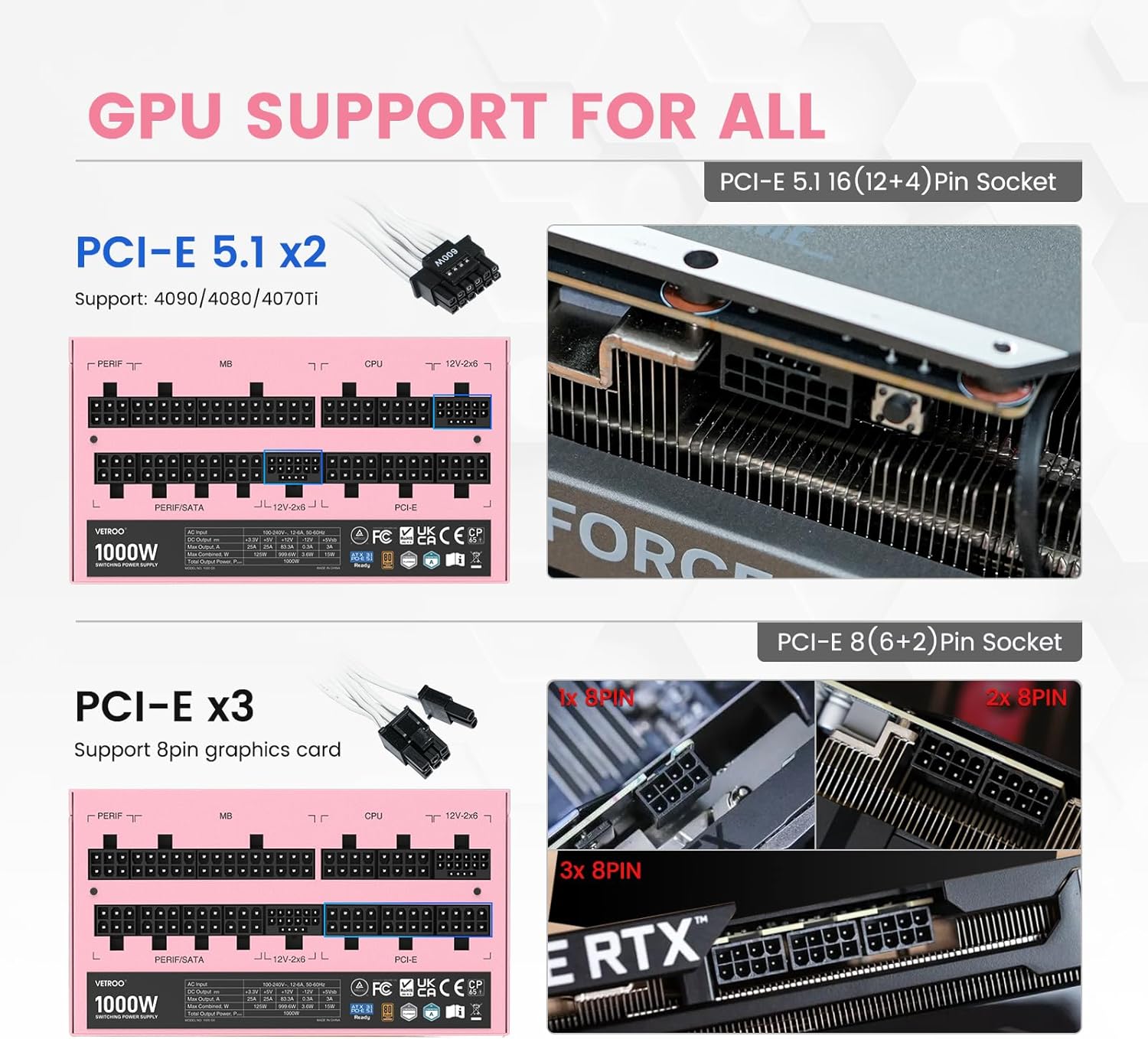 Vetroo 1000W Black Power Supply ATX 3.0 Ready Dual PCIe 5.0, 80 Plus Gold Full Modular, Compact Size, Japanese 105°C Capacitors, Eco Mode with 120mm FDB Fan, 10 Year Warranty, for Gaming PC and More