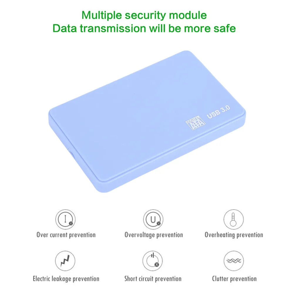 ![]() SATA To USB3.0 HDD Box Compatible with XP/win7/win8/win10 2.5in HDD Enclosure High Speed with USB Cable for SSD External Storage Features: 1. High Speed Transmission: The 3.0 SATA HDD box has a high speed transmission capability, which is much faster than the 2.0 SATA hard drive enclosure. This means that you can transfer large amounts of data to the hard disk cartridge faster, allowing for faster backup or storage of your data. 2. Design: The hard disk case adopts a simple and lightweight design, which is convenient to carry and use. At the same time, it also has shockproof, compression resistant, and durable characteristics, which can be used in various environments, providing reliable data storage and transmission services. 3. High Capacity: The 3.0 SATA HDD nclosure supports high capacity hard disks, which can meet your different storage needs, including backing up a large amount of data such as photos, videos, and documents. 4. Material: The hard disk case is made of ABS material, with high strength and abrasion resistance characteristics, which can protect the hard disk from damage and collision, thereby improving the service life of the hard disk. 5. Easy to Use: The 3.0 SATA hard disk cartridge does not require installing drivers or additional software, but simply connects the hard disk cartridge to the computer to use. It also features an easy-to-use disassembly design that allows you to easily replace your hard disk drive. Specification: Origin: Mainland China Size: 2.5inch Case Material: Plastic Internal interface: SATA (serial interface) External interface: USB (USB 3.0 backward compatible with USB 2.0) Transmission speed: USB3.0 Material: ABS Color: Blue, Dark Blue, Ivory, Pink, Green, Red (optional) Data line length: 40cm System Compatible with XP/win7/win8/win10/vista/Linux/ OS or higher Product size: 120 * 76 * 13mm/4.7*3*0.5in Product weight: 42.7g Note: Due to the different monitor and light effect, the actual color of the item might be slightly different from the color showed on the pictures. Thank you! Please allow 1-2cm measuring deviation due to manual measurement. ![]() 1 x HDD Box 1 x data cable |