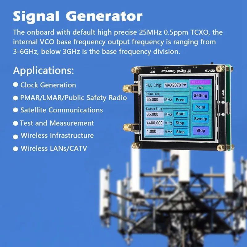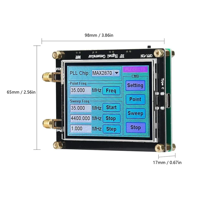 It can be controlled by PC, output amplitude: -4 to 5dBm, 4-level screen controls. Equipped with two frequency output modes, you can choose dot frequency and sweeping frequency according to your demands.